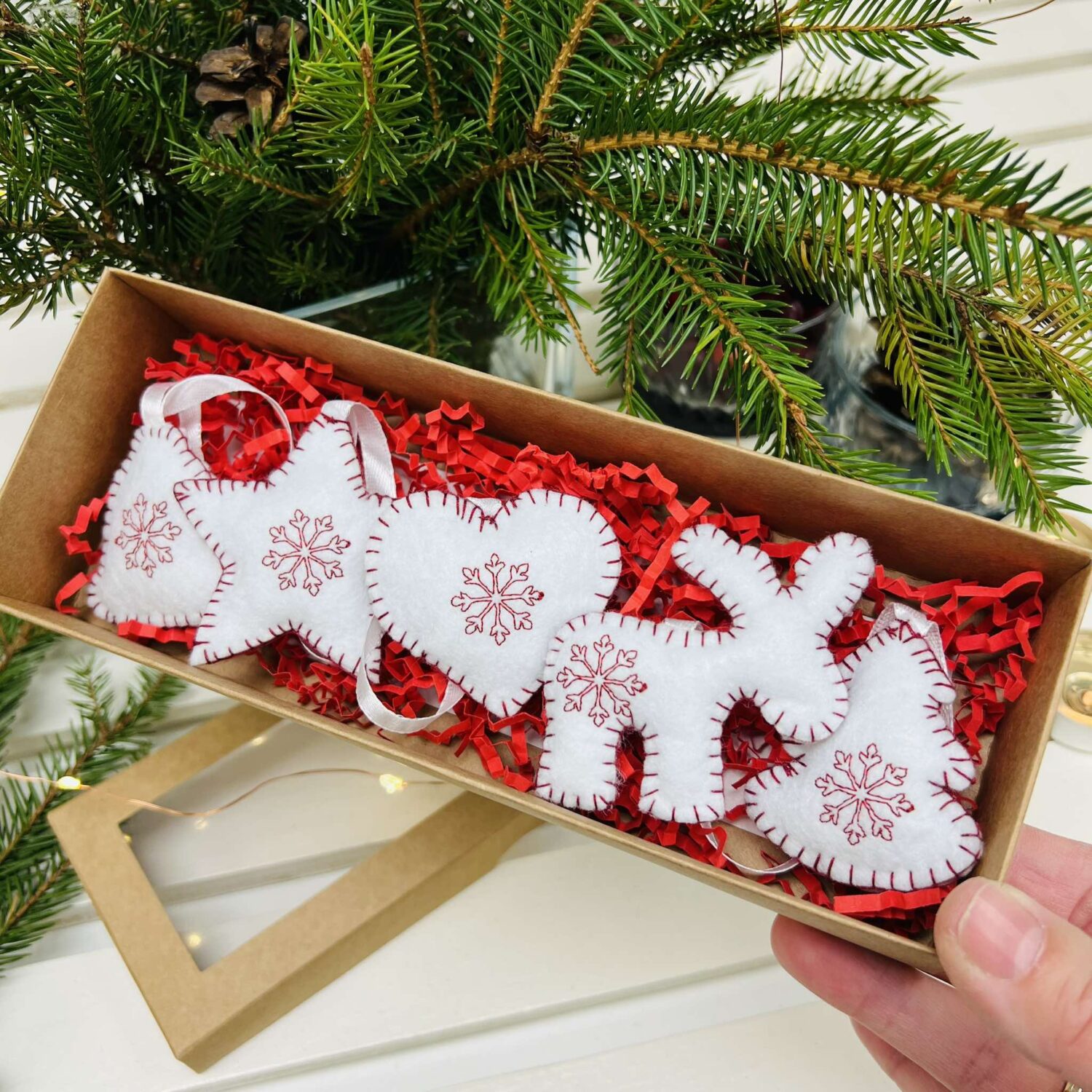 Išsiuvinėti rankų darbo Kalėdų eglutės žaisliukai