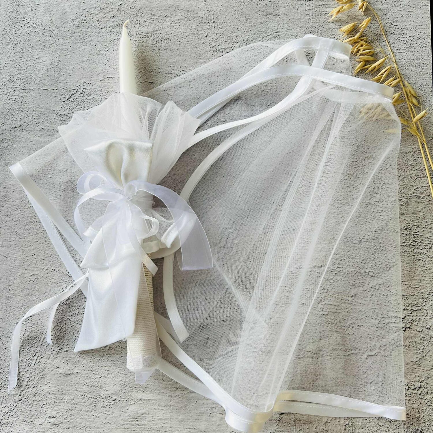 Rankų darbo krikštynų žvakė su kaspinėliais