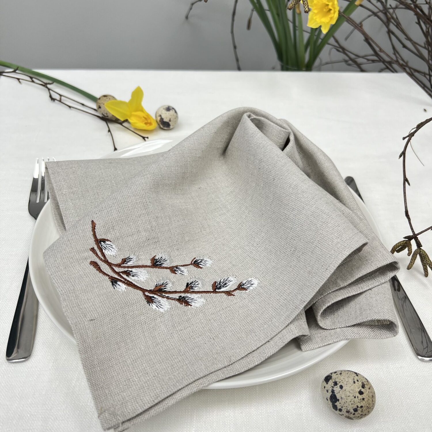 Natūralaus lino servetėlė išsiuvinėta kačiukų šakele