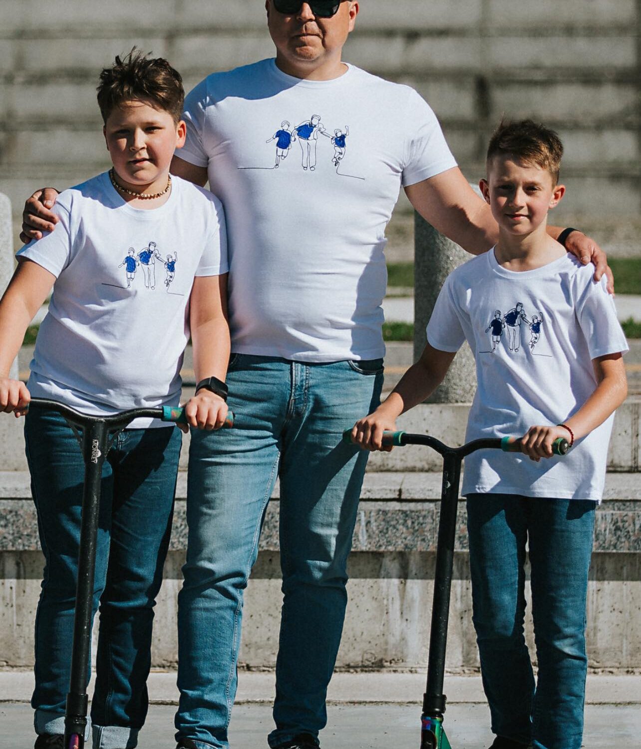 Marškinėliai su išsiuvinėtais tėčio ir vaikų siluetais