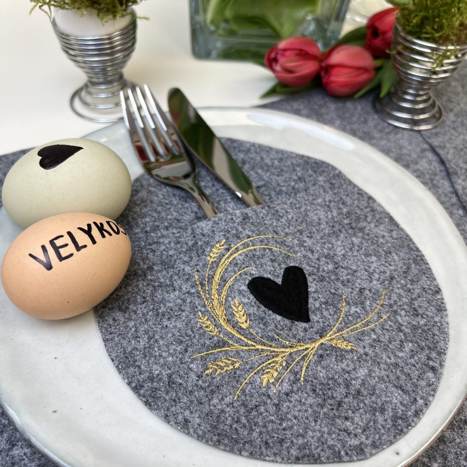 Velykinių padėkliukų komplektas su išsiuvinėta širdele ir ornamentu