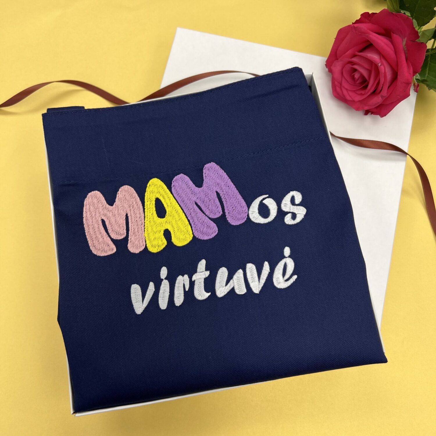 Prijuostė su išsiuvinėtu užrašu „Mamos virtuvė”